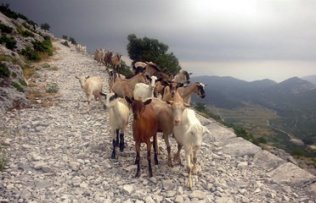 A parade of goats clambered down the path,