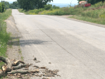 by a fence in the tall grasses, with its hood up, as a dirt road